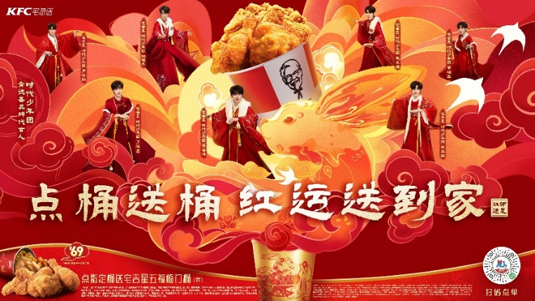 这次,由屡次与肯德基迸发创意火花的“故宫美学”以“瑞兔揽金桶”和“七彩中国色”为新春增喜气。深谙年轻消费群体的肯德基还邀请全新品牌代言人“时代少年团”主演年度贺岁大片“来个金桶就齐了”,希望见证到无数个阖家幸福时刻,在2023年新春增添一份喜气。