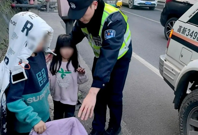 小朋友,你们的爸爸妈妈呢?你们这样走,好危险哦!民警冉启诚停车拦住两个小朋友后担心地说道。