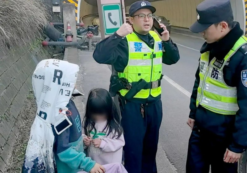 事发当天17时许,石板派出所接到群众报警称开车路过中梁山华福隧道时看到俩小孩在隧道内行走,且无大人陪伴,求助民警。由于隧道内过往车辆可能比较多,加上视野也比较差,民警冉启诚接警后非常担心两名小朋友的安危,便立即带着辅警吴恒阳、潘涛出警。当民警驱车进入隧道时发现隧道内车流量确实比较大,情况十分危险,眼看在隧道内行驶很长一段距离后都没有发现两个小朋友的身影,这让出警三人的心都提到了嗓子眼。万幸的是,快要接近隧道出口的时候民警发现了两个小朋友的身影,一名小男孩骑着儿童滑板车在马路边跑,另一个小女孩屁颠颠地跟在后面追,此时一辆辆的汽车从他们身边呼啸而过。