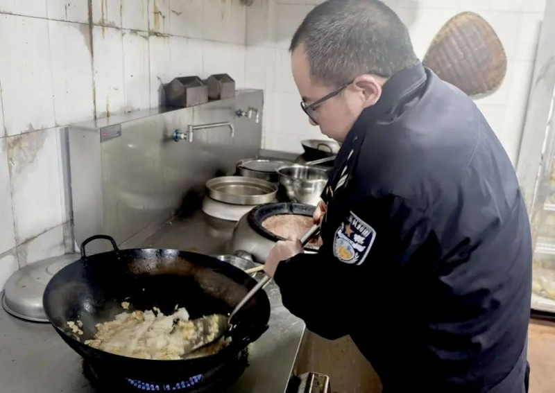 ▲民警冉启诚给孩子做蛋炒饭